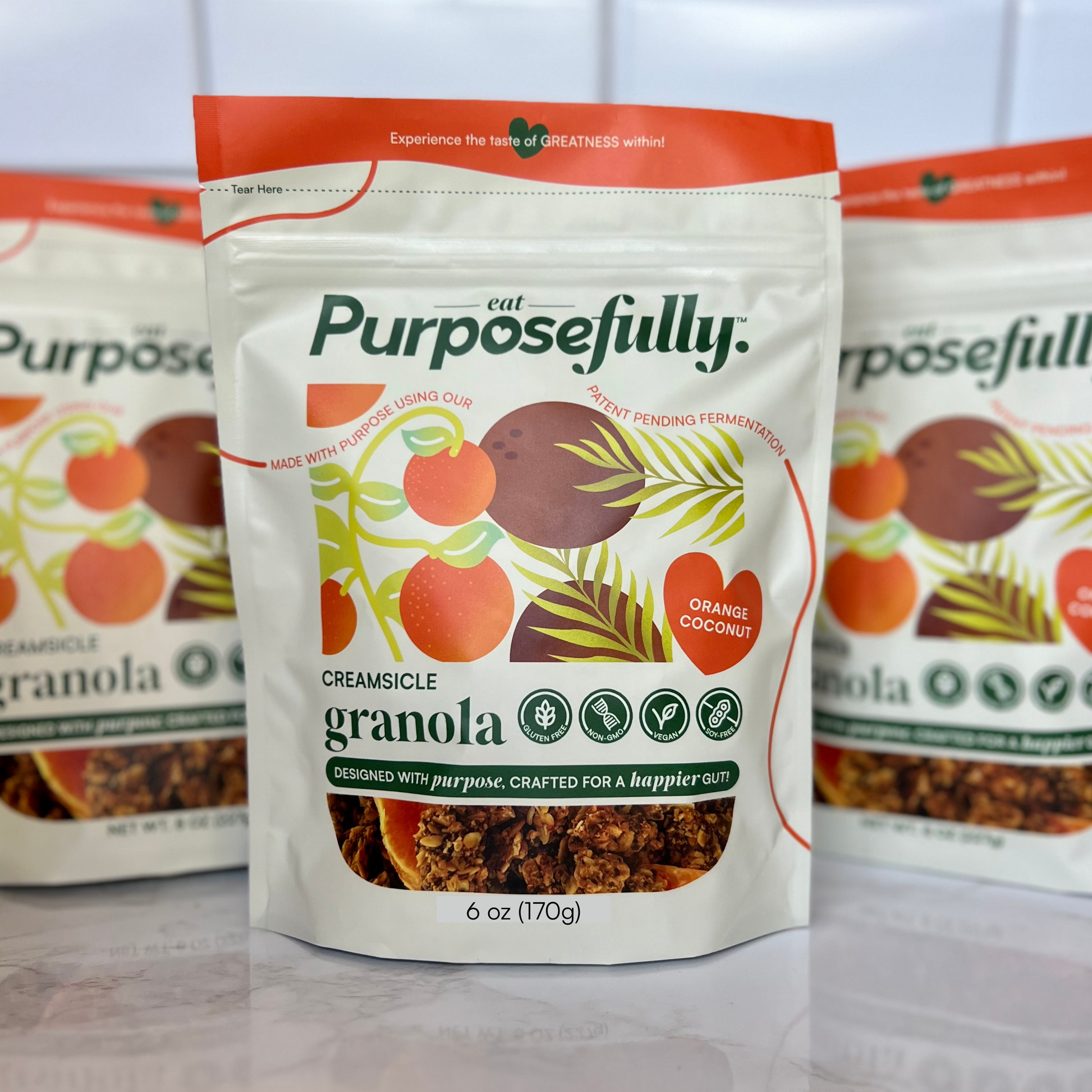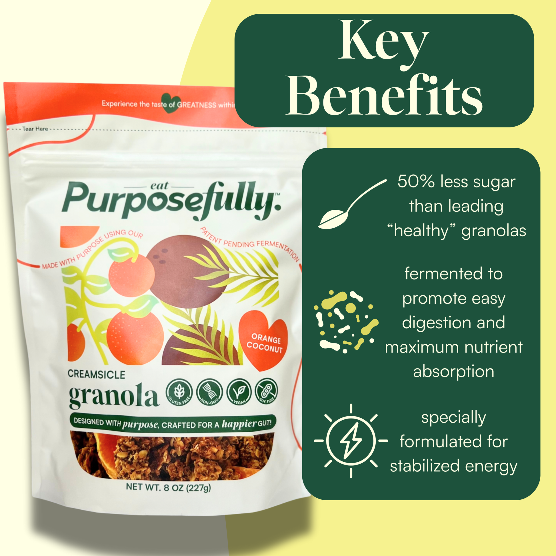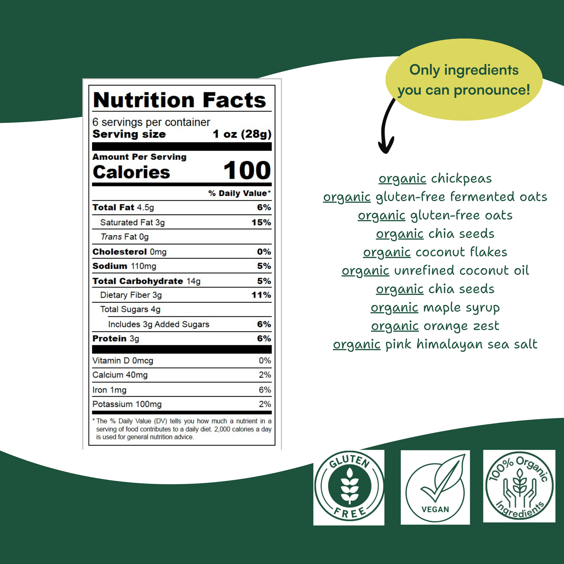 Our Orange Coconut Granola combines zesty orange and toasted coconut for a light, refreshing flavor. Made with organic ingredients and our fermentation process, it’s easy to digest and packed with nutrients. Perfect for topping yogurt or fresh fruit, this granola enhances flavors while supporting your gut health. Simple, delicious, and designed to nourish.